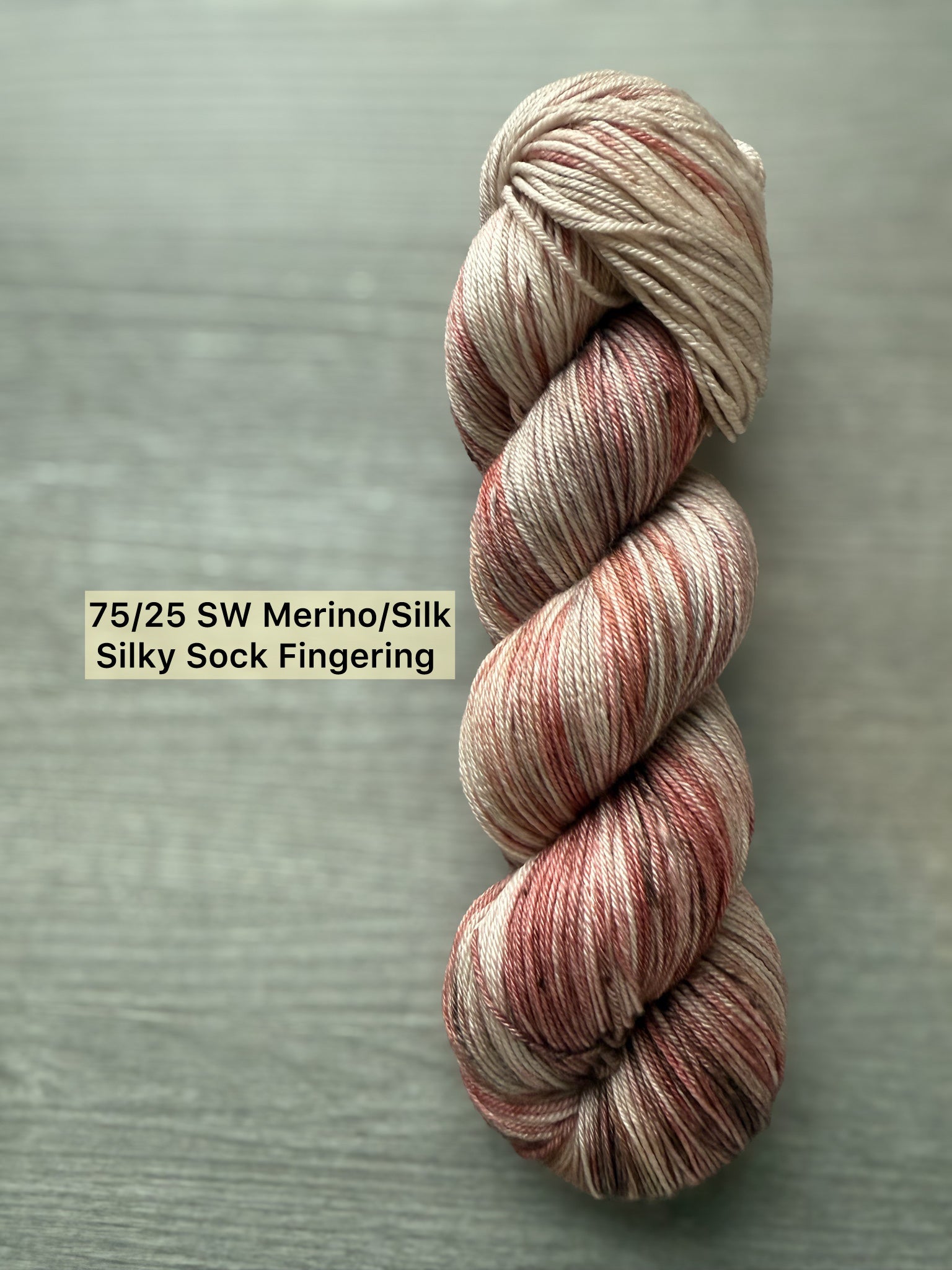 - 75% Super Wash Merino Wool and 25% Silk DK weight. This yarn has a gorgeous sheen and is so soft against the skin! The price is for one Hank/Skein of yarn weighing approximately 100 g with approximately 218 yards in length.
