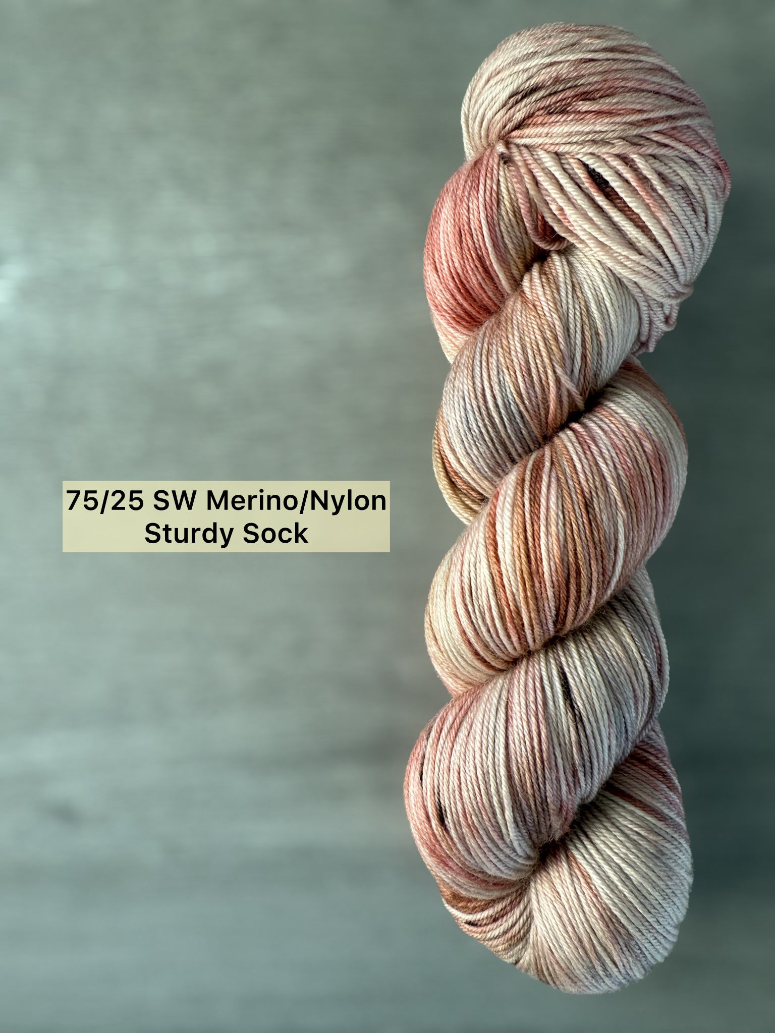Sturdy Sock - 75/25 Super Wash Merino and Nylon Fingering Weight Sock Yarn. Choose this blend for a soft feel with the added longevity of 25% nylon, for those who are hard on socks!