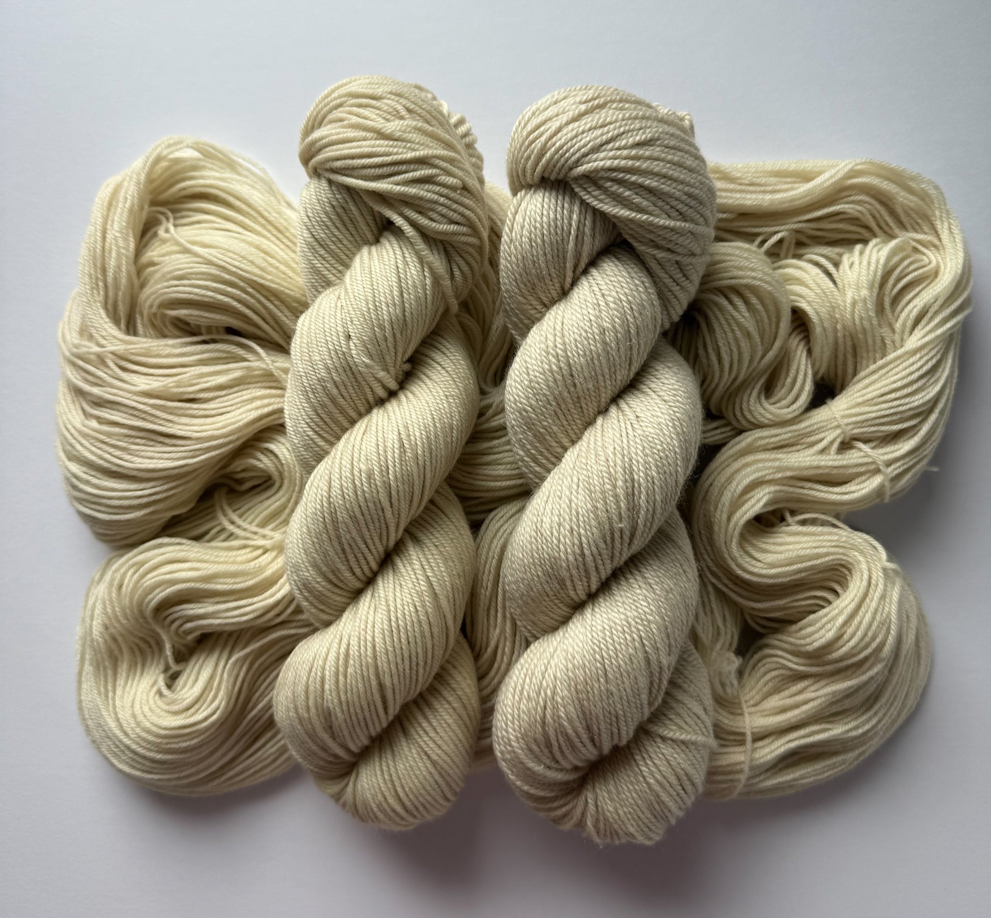 Silky Sock - 75/25 SW Merino and Mulberry Silk. The shine on this blend will take your breath away. Perfect for those intricate shawls you love to create with the added smoothness of the silk. The lack of elasticity in silk allows it to hang softly with fluidity and beautiful drape! Each skein is 100g and approx. 435 yards in length.