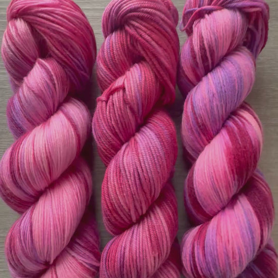 “Love Struck” Hand-dyed yarn in vibrant shades of pink, purple, and red captures the feelings of romance and passion. Each strand is a delightful blend of color, reminiscent of blooming roses and sweethearts’ whispers. The variegated hues dance together, creating a rich tapestry that inspires creativity and warms the heart! As you knit or crochet with this enchanting yarn, it feels as though each stitch is infused with the excitement of new love, making every project a heartfelt expression of affection.